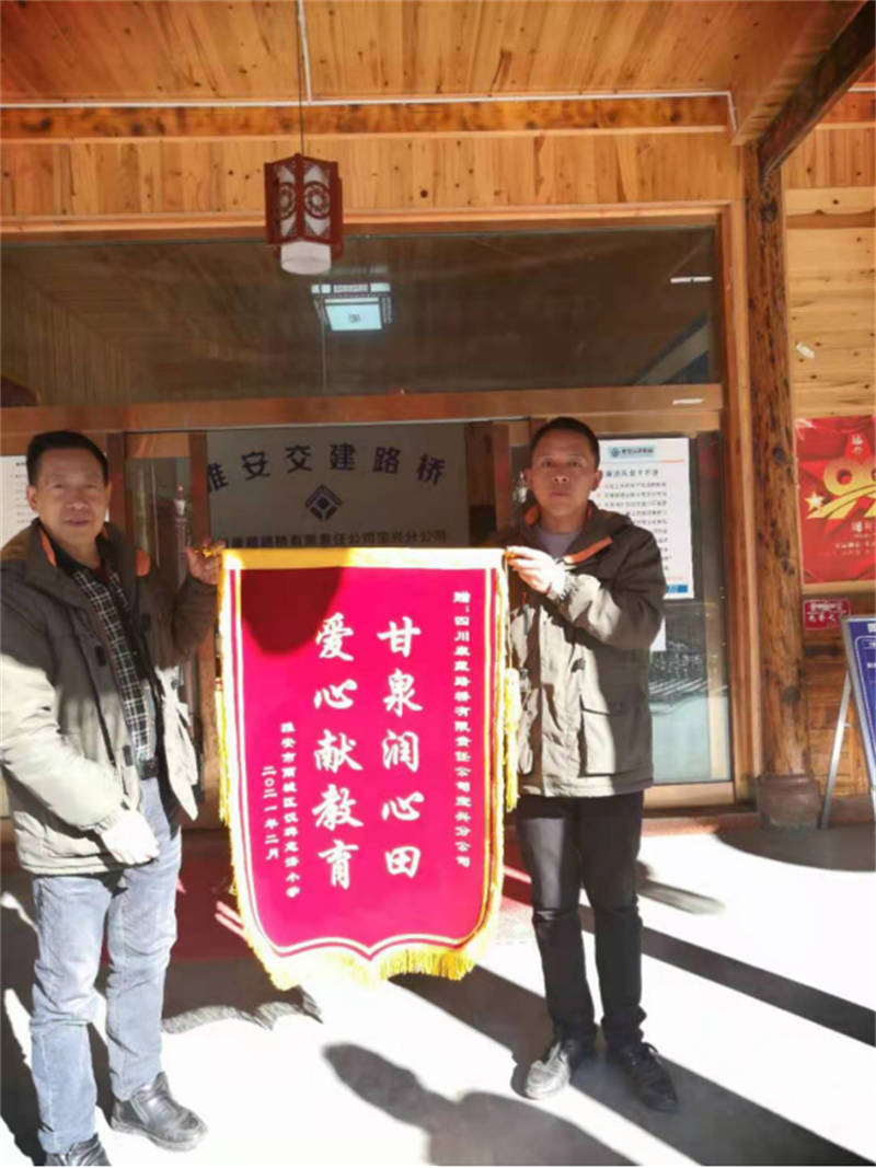 2月19日,雅安市雨城區(qū)第四小學(xué)漢碑校區(qū)將一面繡有“甘泉潤(rùn)心田、愛(ài)心獻(xiàn)教育 ”的錦旗送到交建路橋公司寶興項(xiàng)目部,感謝路橋公司向漢碑校區(qū)捐贈(zèng)5萬(wàn)元基金用以建設(shè)該校勞動(dòng)教育烹飪基地。