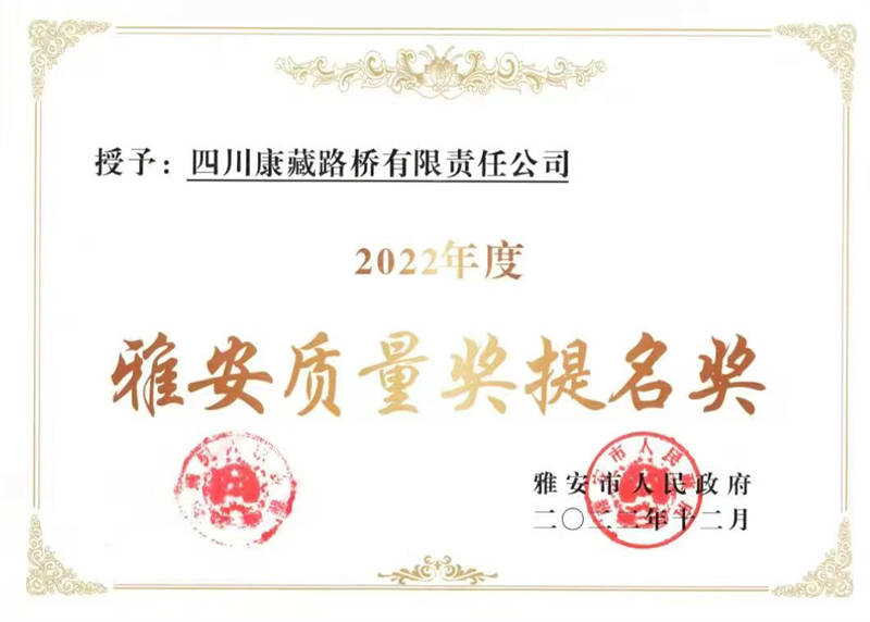 近日,雅安市人民政府根據(jù)《雅安質量獎評審管理辦法》相關規(guī)定,公布了“2022 年度雅安質量獎”,交建路橋榮獲“2022 年度雅安質量獎提名獎”稱號。