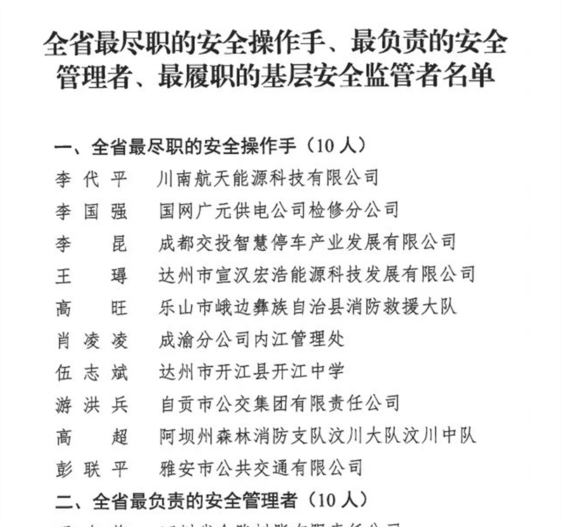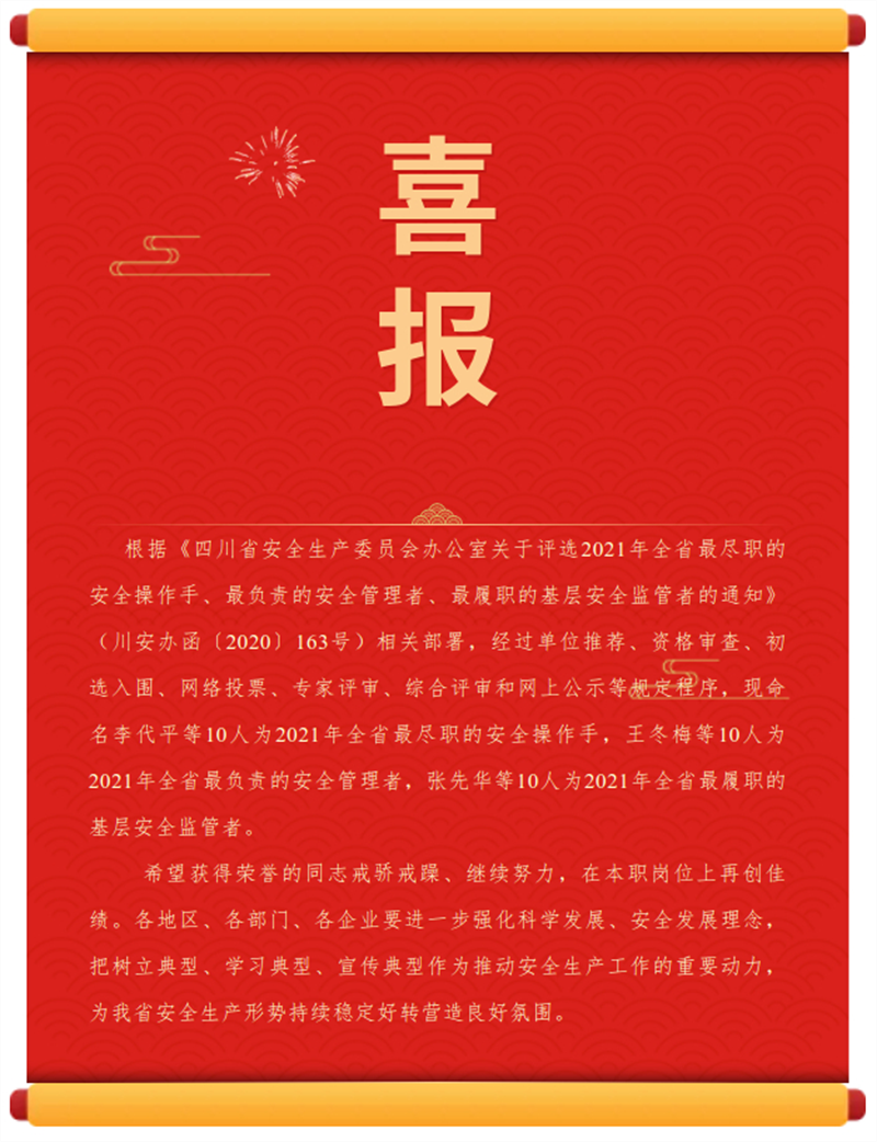 此次評選活動,最終命名“全省最盡職的安全操作手、最負責的安全管理者、最履職的基層安全監(jiān)管者”各10名。彭聯平通過單位自薦、資格審查、初選入圍、網絡投票、專家評審、綜合評審和網上公示層層選拔,最終獲得“2021年全省最盡職的安全操作手”稱號,是雅安市唯一獲此殊榮的個人。
