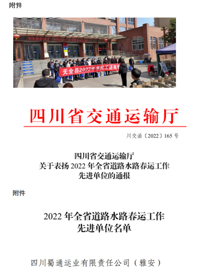 蜀通公司榮獲“2022年全省道路水路春運工作先進(jìn)單位”稱號