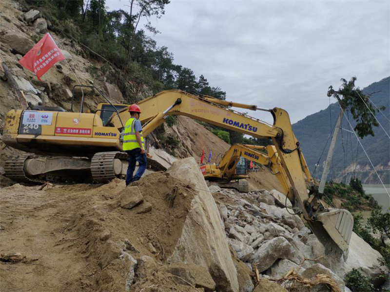 黨委書記、董事長漆家華,黨委副書記、總經理羅倫全,黨委副書記張萬清陸續(xù)前往石棉,直插道路搶險一線,實地了解受災情況,靠前指揮搶通保通,看望慰問一線員工。副總經理鐘焱宇至始至終堅守搶險現(xiàn)場,勘察路況災情,會商搶險方案,協(xié)調組織搶險保通。截至9月13日,交建集團累計派出搶通力量170余人,挖掘機、拖車、裝載機、運輸車、無人機等機具70余臺套,先后完成G108線石棉縣至菩薩崗段12個坍方點、X067先新桃縣道16個坍方點搶通任務,清理坍方7萬余方,改線X067縣道桃壩處繞行路43余公里;搶通省道217線龍頭石隧道至王崗坪段道路20余公里,清方14萬余方;搶通草科鄉(xiāng)和坪村至毛坪通組道路,為極重災村打通一條重要生命通道。同時,出動應急運輸保障車45臺次、運輸物質22趟次,轉運災區(qū)搶險救援人員、組織群眾疏散840余人,組織出租車護送防疫人員和核酸樣本轉運1140余趟次。