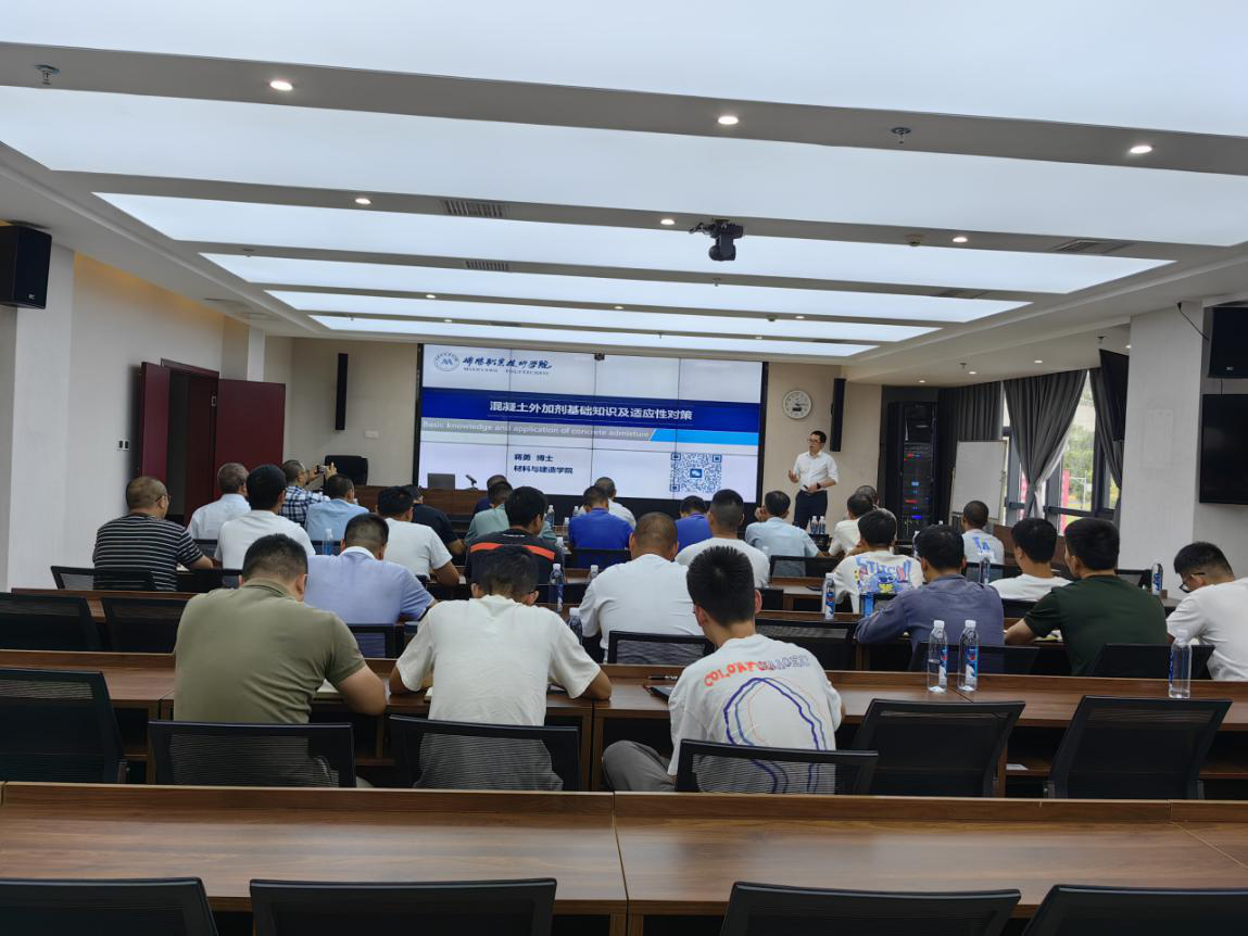 培訓(xùn)邀請綿陽職業(yè)技術(shù)學(xué)院材料與建造學(xué)院院長賈陸軍、蔣勇兩位博士授課,重點圍繞配合比設(shè)計中需注意的事項展開,詳細(xì)講解配合比設(shè)計要點,分析原材料選擇及礦粉、粉煤灰摻合料摻配比例的重要性,總結(jié)交流機制砂在混凝土中的應(yīng)用技術(shù),講解混凝土外加劑基礎(chǔ)知識、分析目前外加劑在使用過程中適應(yīng)性問題和原因,通過真實案例分析混凝土質(zhì)量問題的原因及管控要點等。