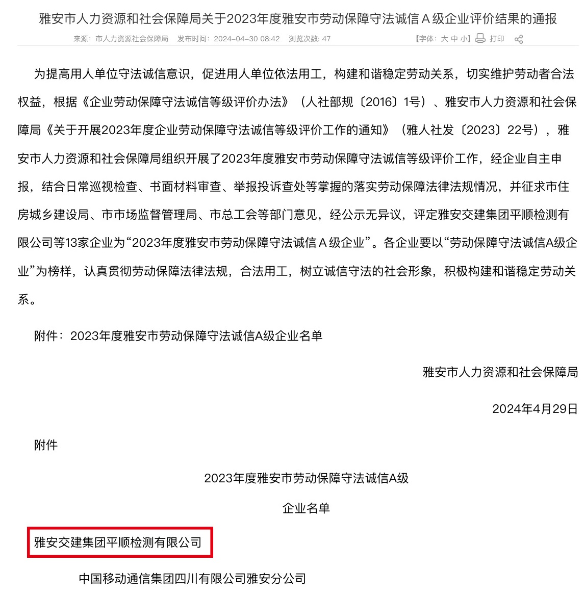 近日,雅安市人社局發(fā)布通報(bào),雅安交建集團(tuán)平順公司被評(píng)定為“2023年度雅安市勞動(dòng)保障守法誠信A級(jí)企業(yè)”。此次評(píng)選由人社局結(jié)合日常巡視檢查、書面材料審查、舉報(bào)投訴查處以及專項(xiàng)檢查等活動(dòng)掌握的落實(shí)勞動(dòng)保障法律法規(guī)情況,并征求市場監(jiān)管局等部門和單位意見后,綜合評(píng)定而出。