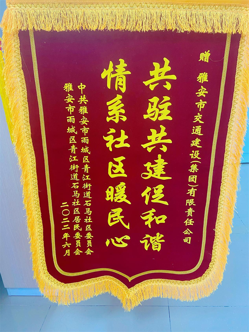 6月29日,雅安市交建集團(tuán)作為石馬社區(qū)結(jié)對(duì)共建先進(jìn)單位,受邀參加了中共雅安市雨城區(qū)青江街道石馬社區(qū)工作委員會(huì)組織召開(kāi)的慶祝建黨101周年大會(huì)暨2022年度先進(jìn)表彰大會(huì),石馬社區(qū)黨委書(shū)記周麗娟同志為交建集團(tuán)贈(zèng)送“情系社區(qū)解難事 共駐共建促和諧”錦旗。