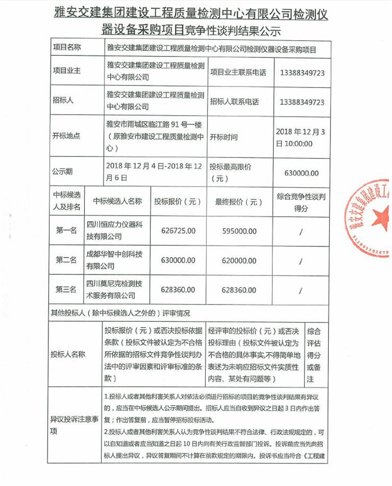 雅安交建集團(tuán)建設(shè)工程質(zhì)量檢測中心有限公司檢測儀器設(shè)備采購項(xiàng)目競爭性談判結(jié)果公示