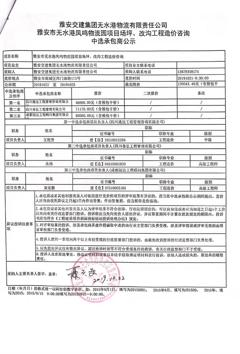 雅安交建集團(tuán)無水港物流有限責(zé)任公司雅安市無水港鳳鳴物流園項(xiàng)目場坪、改溝工程造價咨詢中選承包商公示