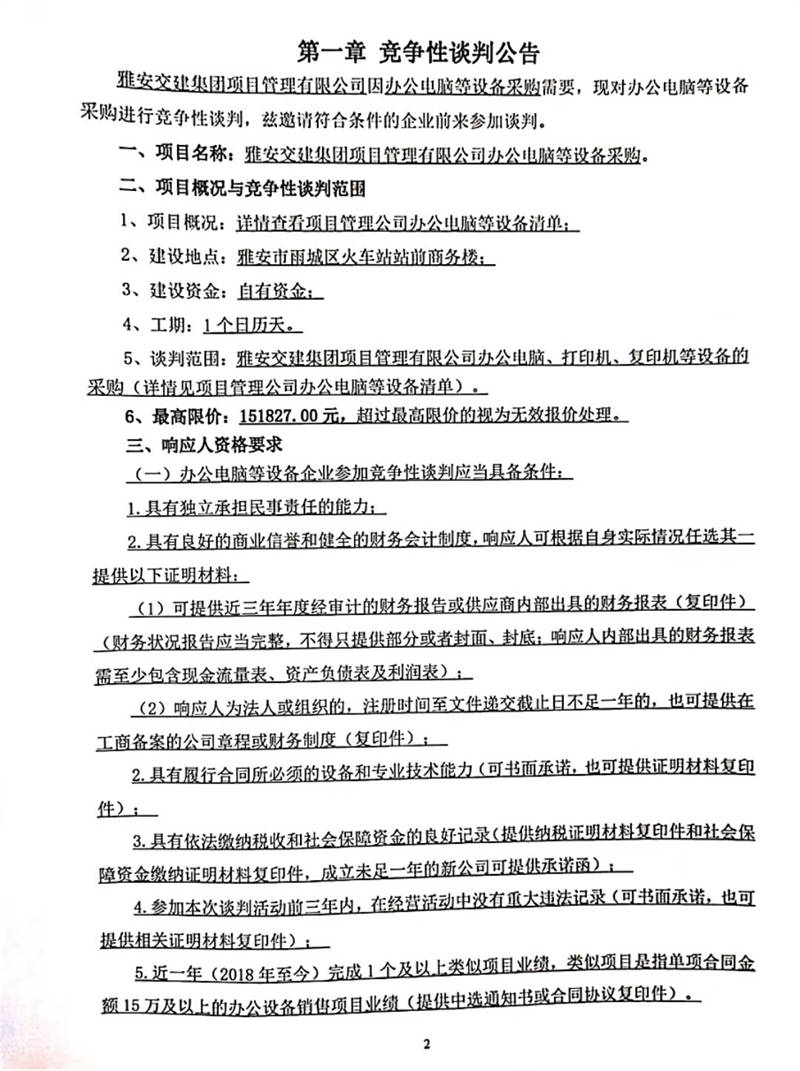 雅安交建集團(tuán)項(xiàng)目管理有限公司辦公電腦等設(shè)備采購競爭性談判公告