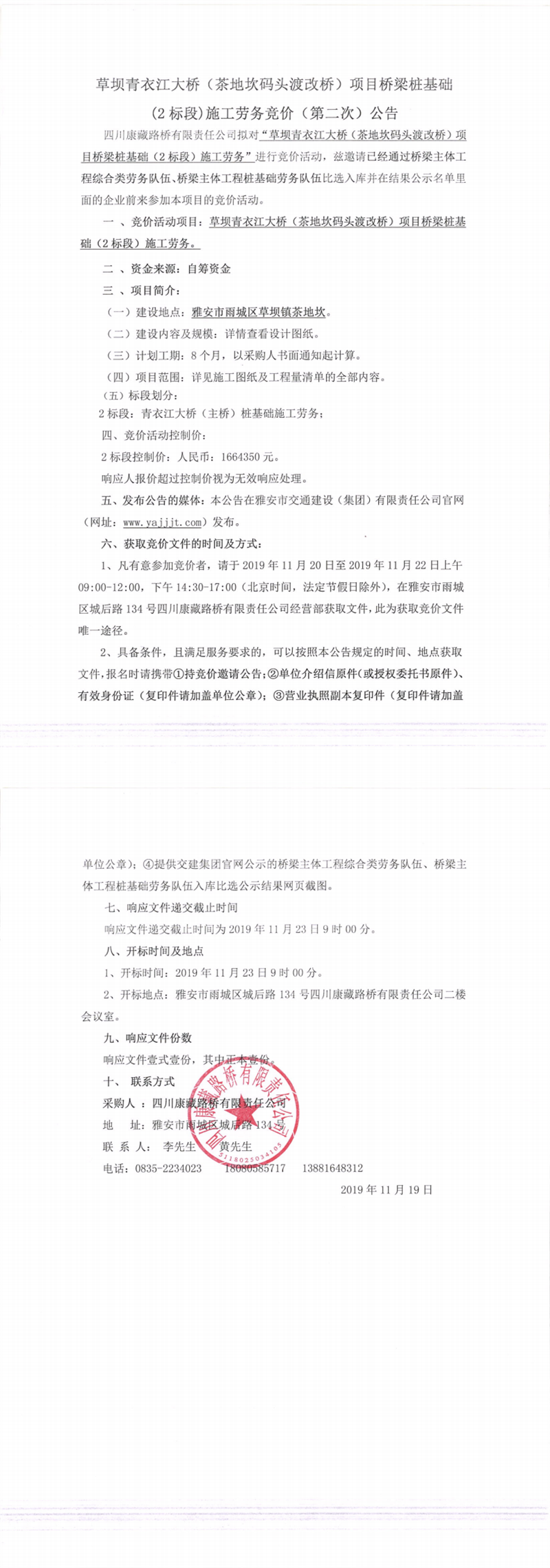四川康藏路橋有限責任公司草壩青衣江大橋(茶地坎碼頭渡改橋)項目橋梁樁基礎(chǔ)(2標段)施工勞務(wù)競價(第二次)公告
