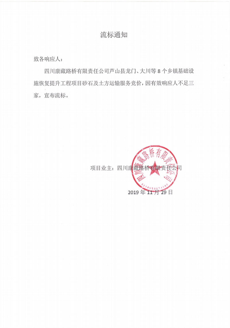 四川康藏路橋有限責任公司蘆山縣龍門、大川等8個鄉(xiāng)鎮(zhèn)基礎(chǔ)設(shè)施恢復提升工程項目砂石及土方運輸服務競價流標通知