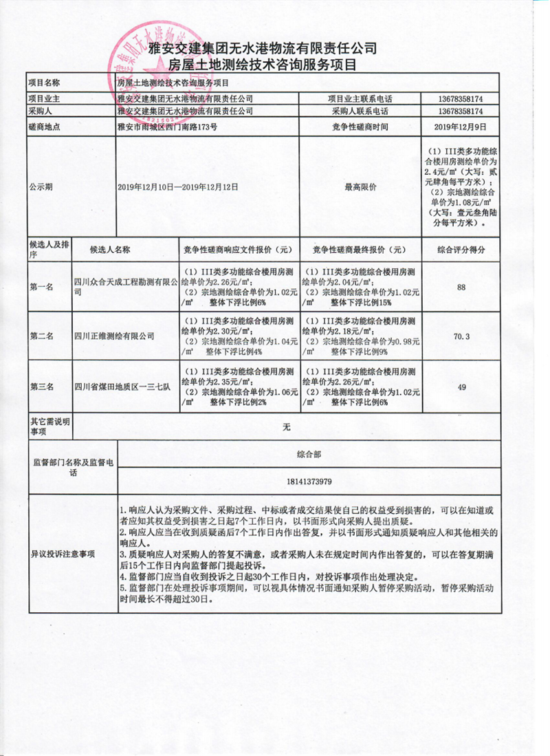 雅安交建集團(tuán)無(wú)水港物流有限責(zé)任公司房屋土地測(cè)繪技術(shù)咨詢服務(wù)項(xiàng)目競(jìng)爭(zhēng)性磋商結(jié)果公示