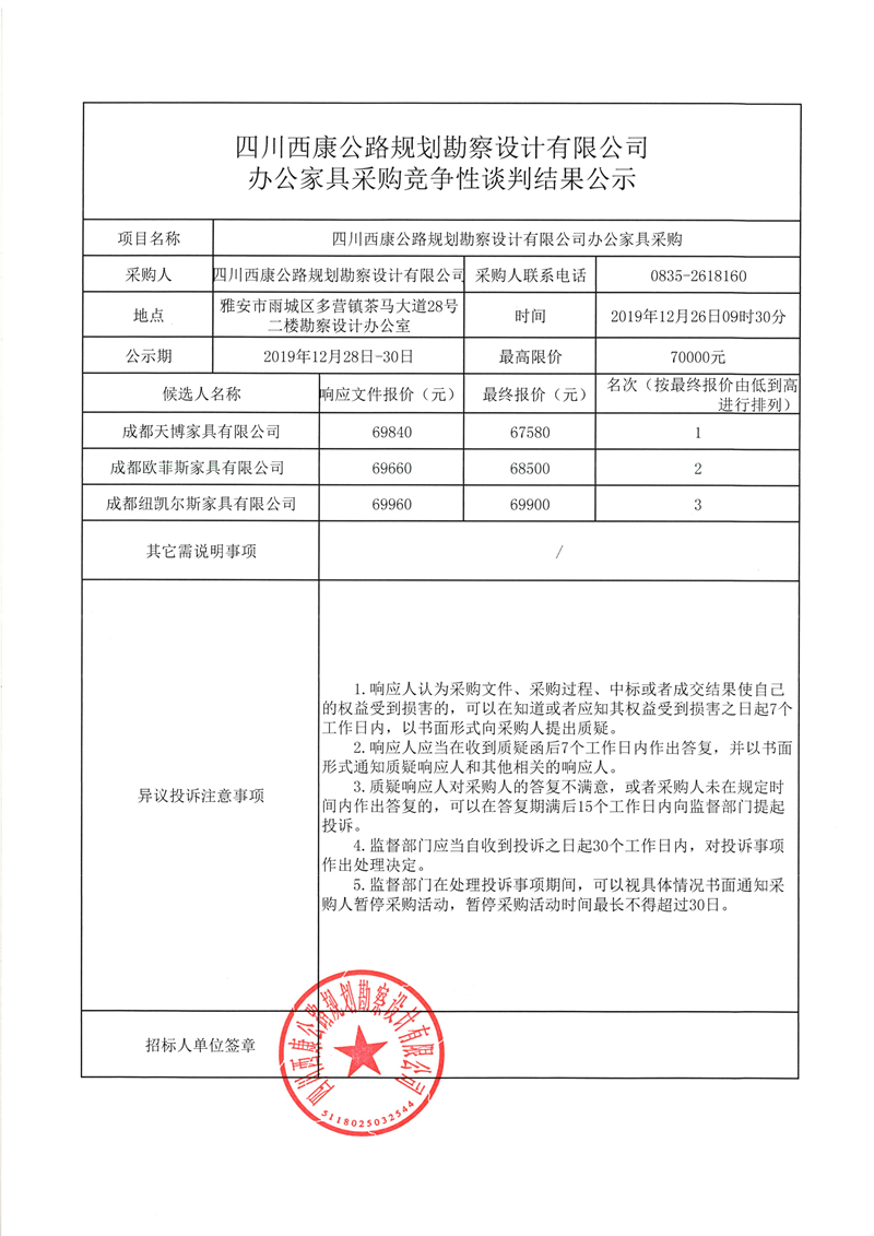 四川西康公路規(guī)劃勘察設(shè)計有限公司辦公家具采購競爭性談判結(jié)果公示