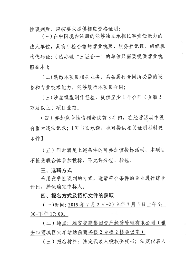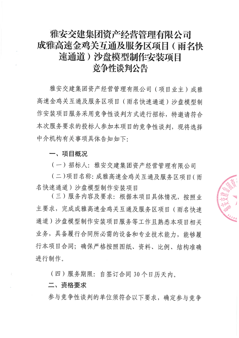 雅安交建集團(tuán)資產(chǎn)經(jīng)營管理有限公司成雅高速金雞關(guān)互通及服務(wù)區(qū)項目(雨名快速通道)沙盤模型制作安裝項目競爭性談判公告