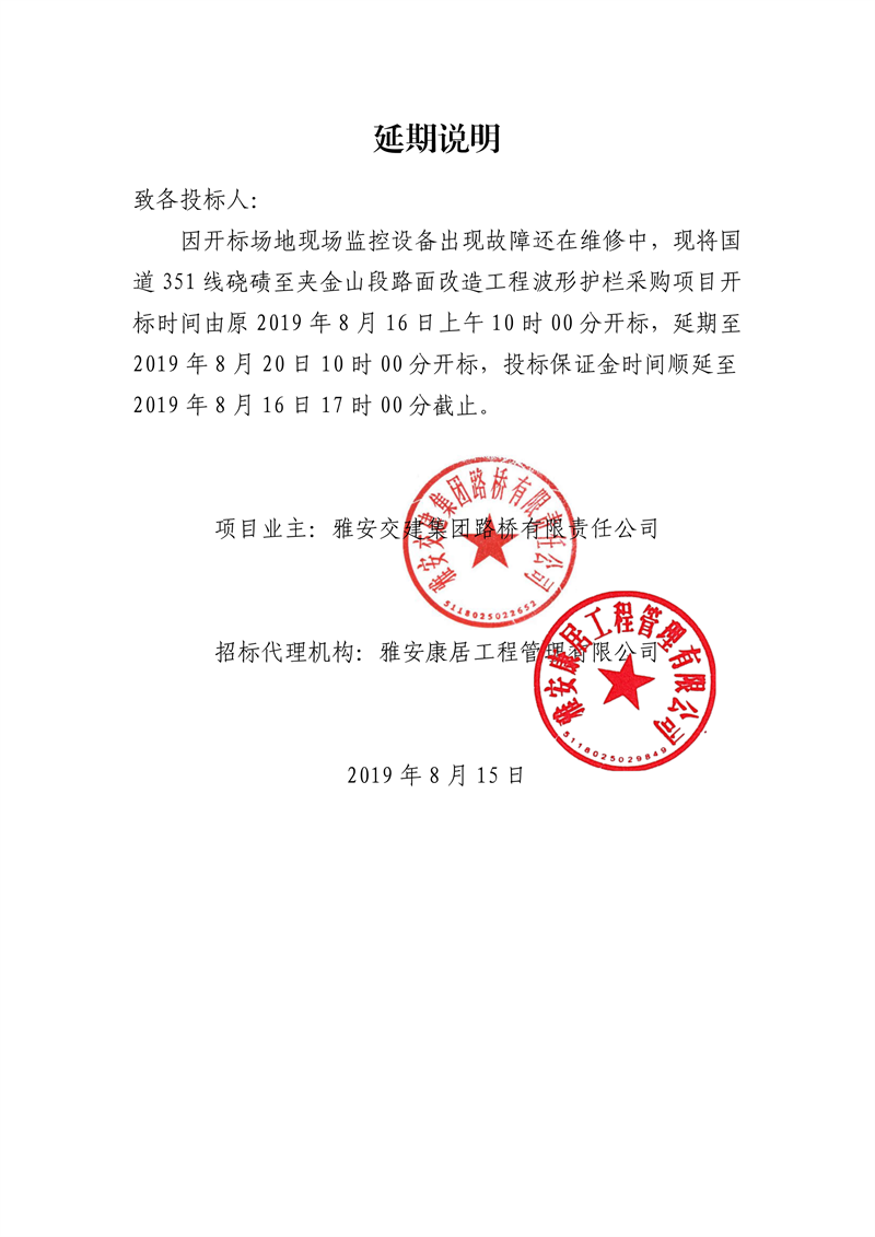 雅安交建集團(tuán)路橋有限責(zé)任公司國(guó)道351線(xiàn)磽磧至夾金山段路面改造工程波形護(hù)欄采購(gòu)延期說(shuō)明