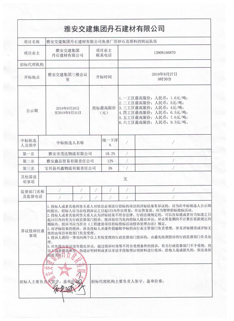 雅安交建集團(tuán)丹石建材有限公司魚泉廠區(qū)砂石及原料的轉(zhuǎn)運(yùn)隊(duì)伍項(xiàng)目競價(jià)結(jié)果公示