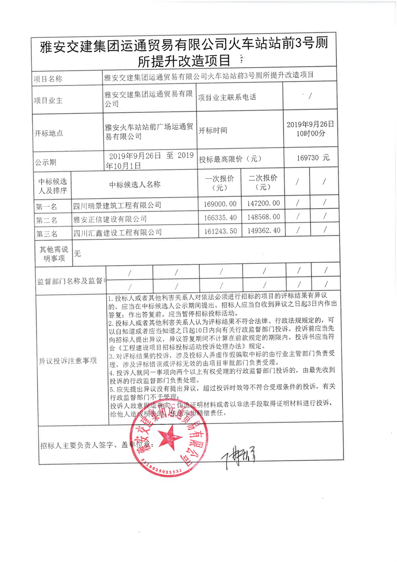 雅安交建集團運通貿易有限公司火車站站前廣場3號廁所改造提升項目(第二次)競爭性談判結果公示