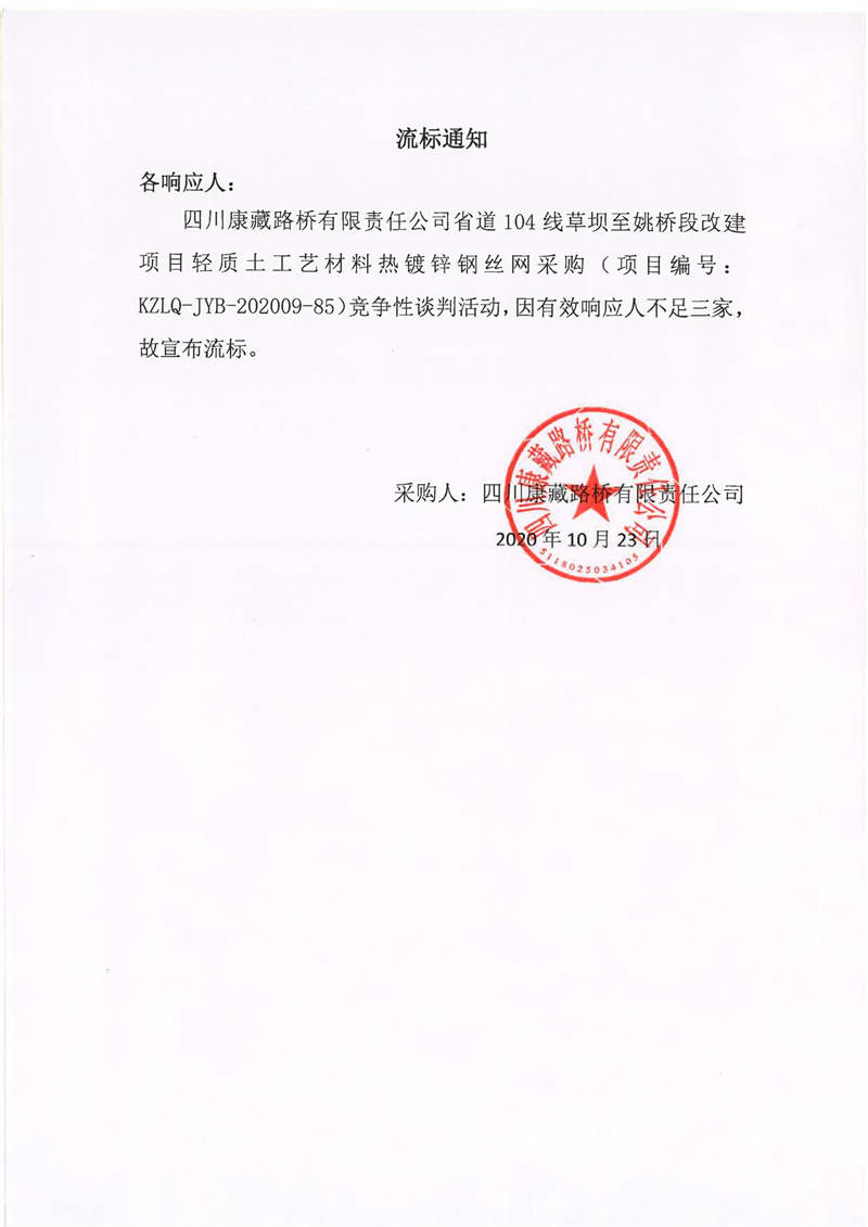 四川康藏路橋有限責任公司省道104線草壩至姚橋段改建項目輕質土工藝材料熱鍍鋅鋼絲網采購項目流標通知