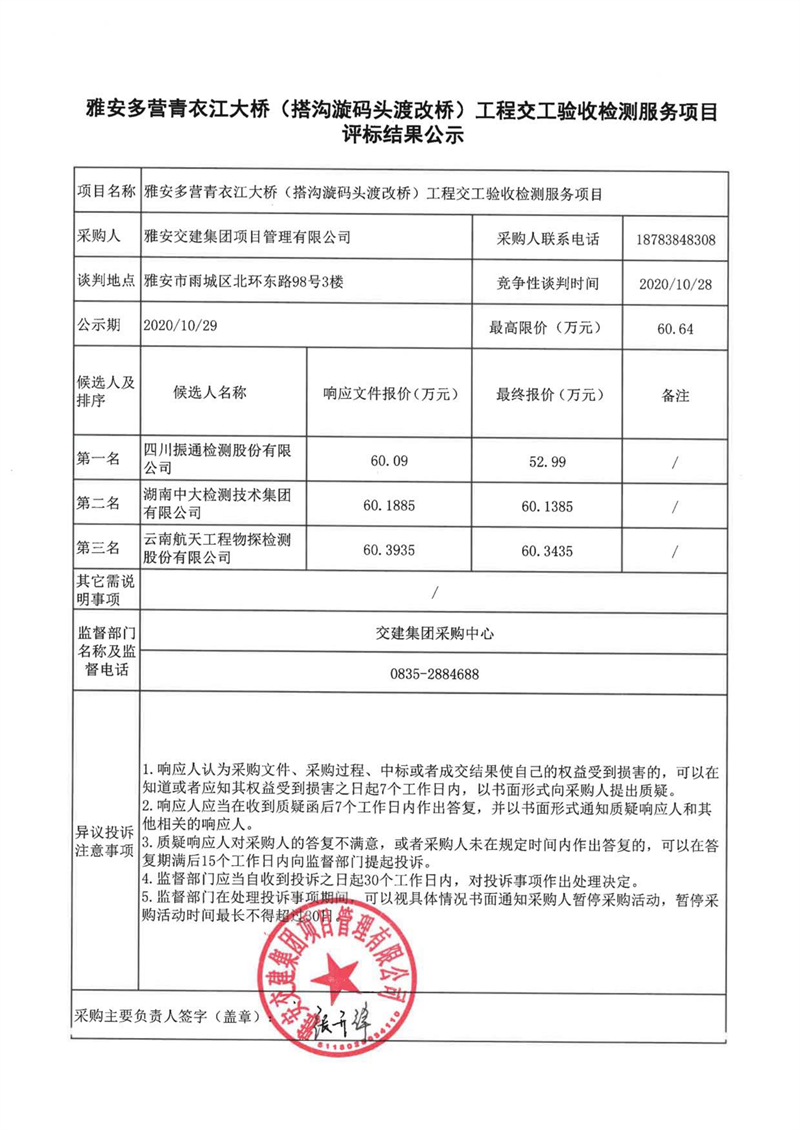 雅安交建集團(tuán)項(xiàng)目管理有限公司雅安多營青衣江大橋(搭溝漩碼頭渡改橋)工程交工驗(yàn)收檢測服務(wù)項(xiàng)目評(píng)標(biāo)結(jié)果公示