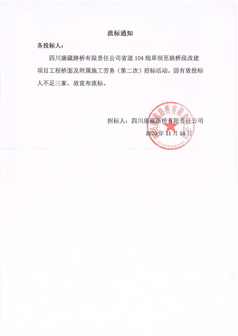 四川康藏路橋有限責(zé)任公司省道104線(xiàn)草壩至姚橋段改建項(xiàng)目工程橋面及附屬施工勞務(wù)(第二次)流標(biāo)通知