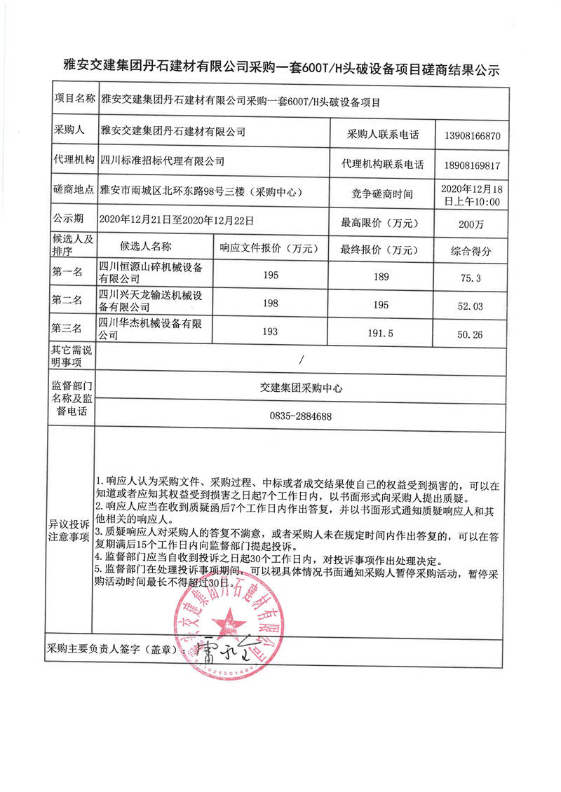 雅安交建集團丹石建材有限公司采購一套600T/H頭破設備項目磋商結果公示