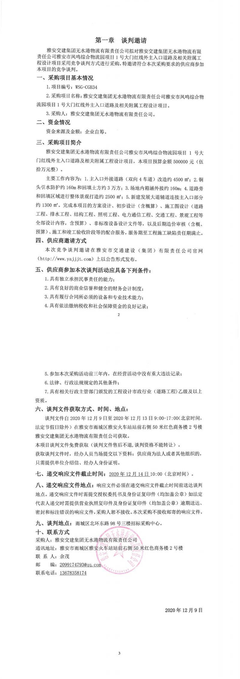 雅安交建集團(tuán)無水港物流有限責(zé)任公司雅安市鳳鳴綜合物流園項目1號大門紅線外主入口道路及相關(guān)附屬工程設(shè)計項目競爭談判公告