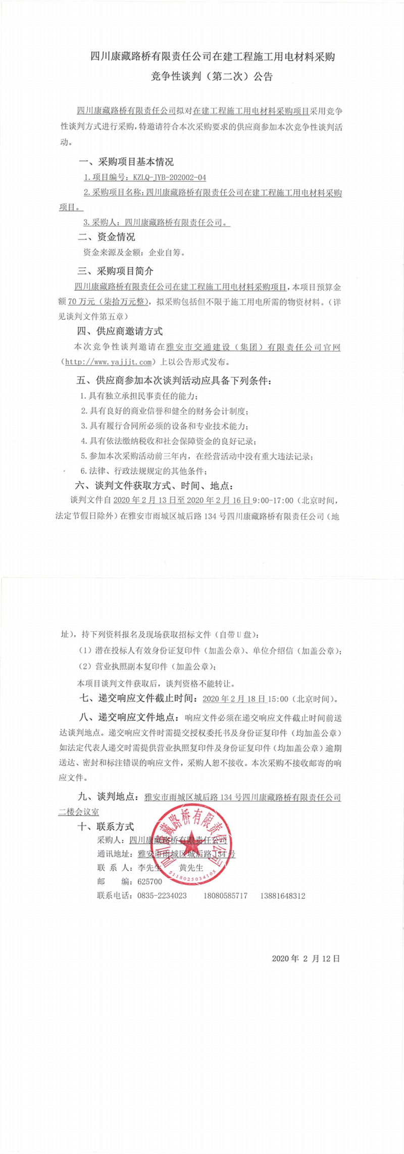 四川康藏路橋有限責(zé)任公司在建工程施工用電材料采購(gòu)競(jìng)爭(zhēng)性談判(第二次)公告