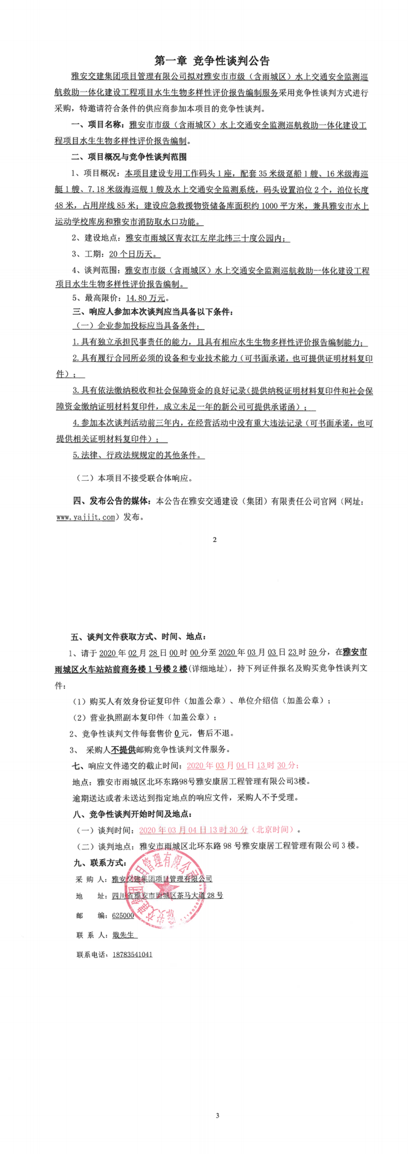 雅安交建集團(tuán)項(xiàng)目管理有限公司雅安市市級(jí)(含雨城區(qū))水上交通安全監(jiān)測巡航救助一體化建設(shè)工程項(xiàng)目水生生物多樣性評(píng)價(jià)報(bào)告編制競爭性談判公告