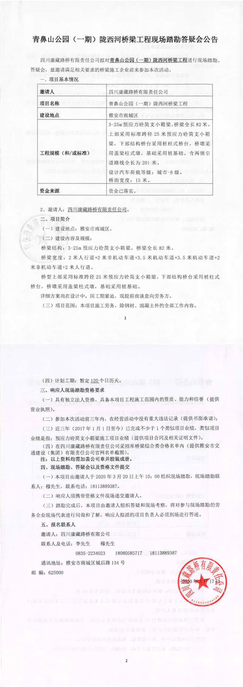 四川康藏路橋有限責(zé)任公司青鼻山公園(一期)隴西河橋梁工程現(xiàn)場(chǎng)踏勘答疑會(huì)公告