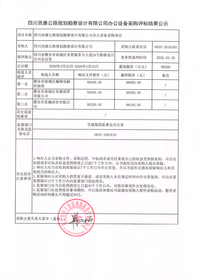四川西康公路規(guī)劃勘察設(shè)計(jì)有限公司辦公設(shè)備采購評(píng)標(biāo)結(jié)果公示