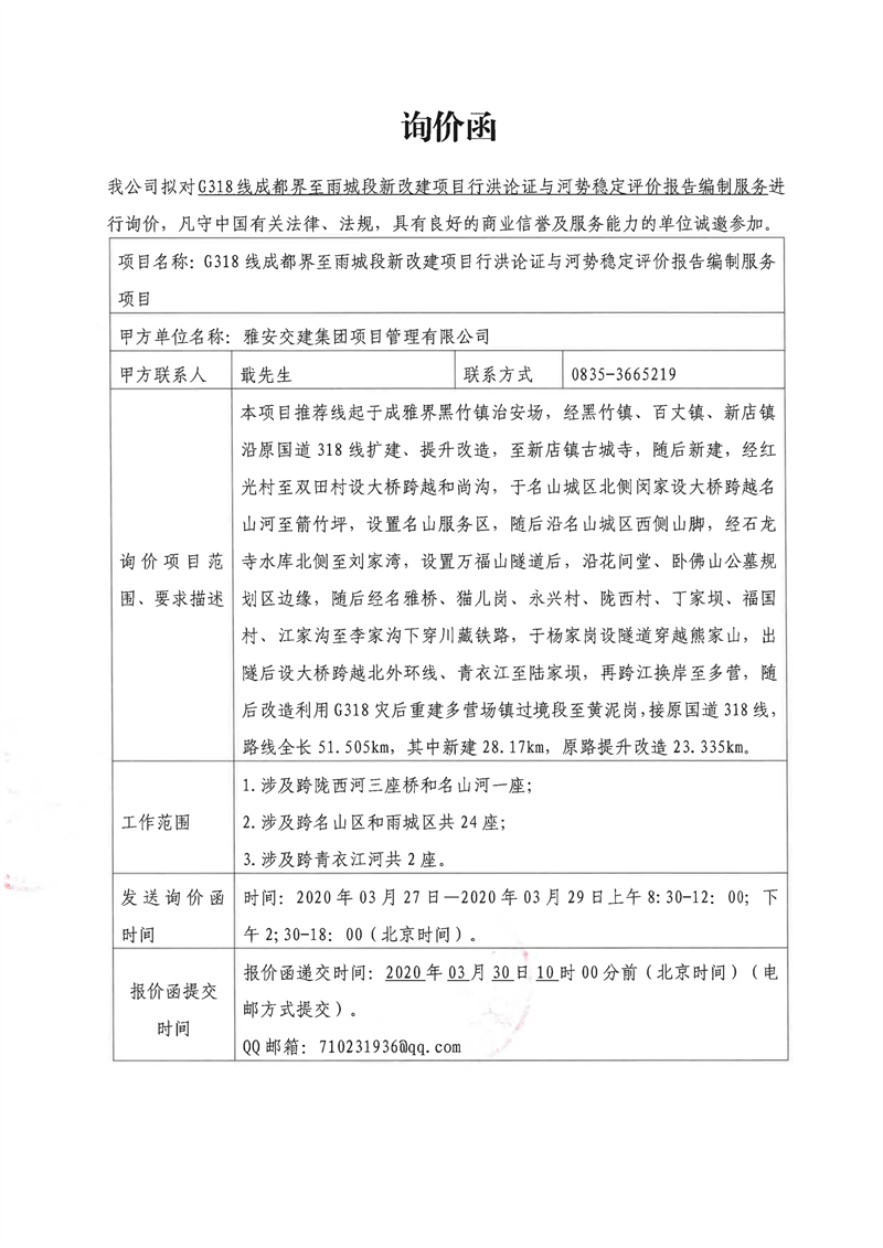 雅安交建集團項目管理有限公司G318線成都界至雨城段新改建項目行洪論證與河勢穩(wěn)定評價報告編制服務(wù)項目詢價函