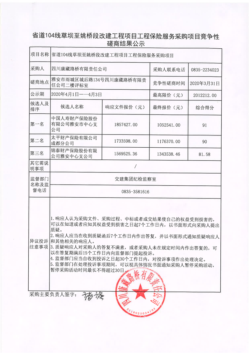 四川康藏路橋有限責任公司省道104線草壩至姚橋段改建工程項目工程保險服務采購項目競爭性磋商結(jié)果公示