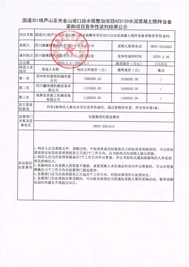 四川康藏路橋有限責任公司國道351線蘆山至夾金山埡口段水毀整治項目在建工程項目HZS120水泥混凝土攪拌設備采購項目競爭性談判結果公示
