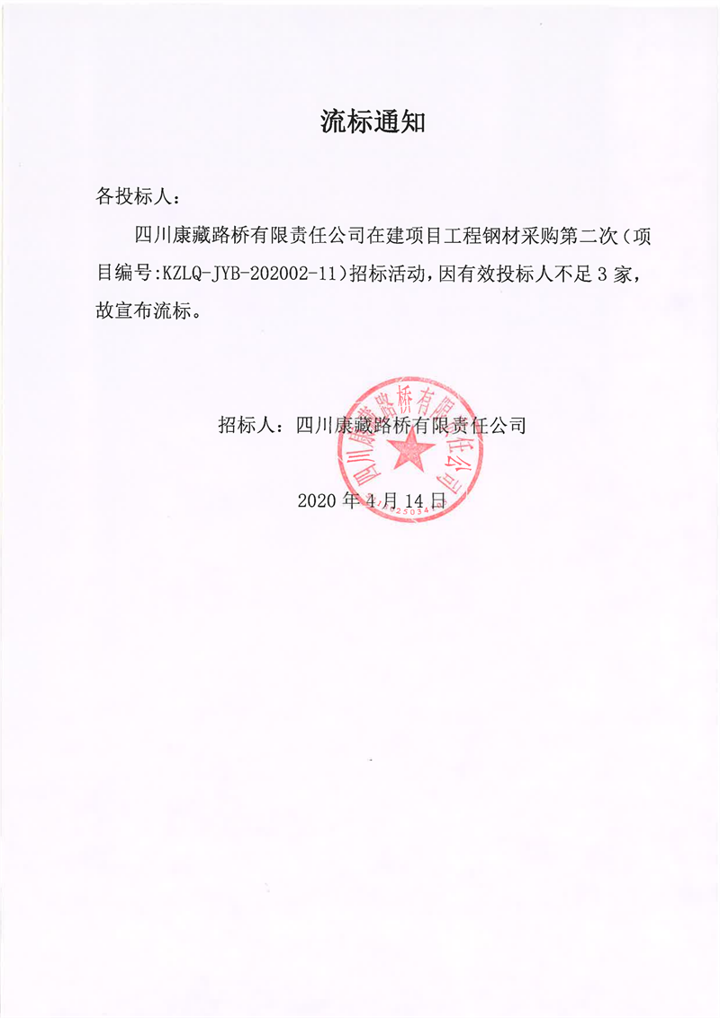 四川康藏路橋有限責(zé)任公司在建項(xiàng)目工程鋼材采購(gòu)第二次流標(biāo)通知