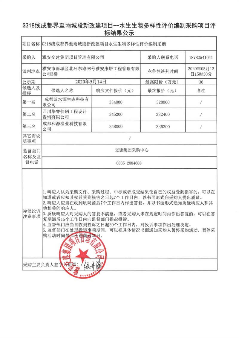 雅安交建集團項目管理有限公司G318線成都界至雨城段新改建項目水生生物多樣性評價編制采購項目評標結(jié)果公示