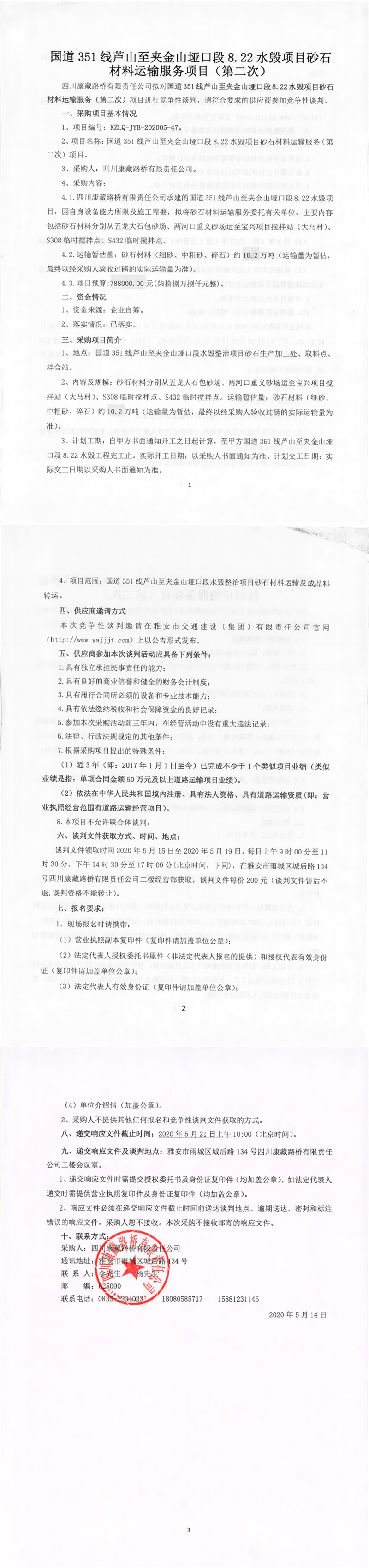 四川康藏路橋有限責(zé)任公司國道351線蘆山至夾金山埡口段8.22水毀項目砂石材料運輸服務(wù)項目(第二次)競爭性談判公告