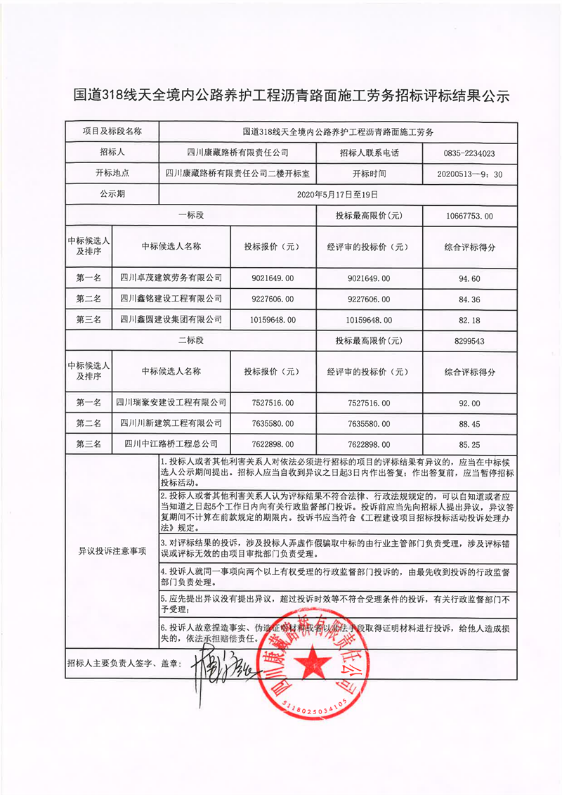 四川康藏路橋有限責(zé)任公司國道318線天全境內(nèi)公路養(yǎng)護(hù)工程瀝青路面施工勞務(wù)招標(biāo)評(píng)標(biāo)結(jié)果公示