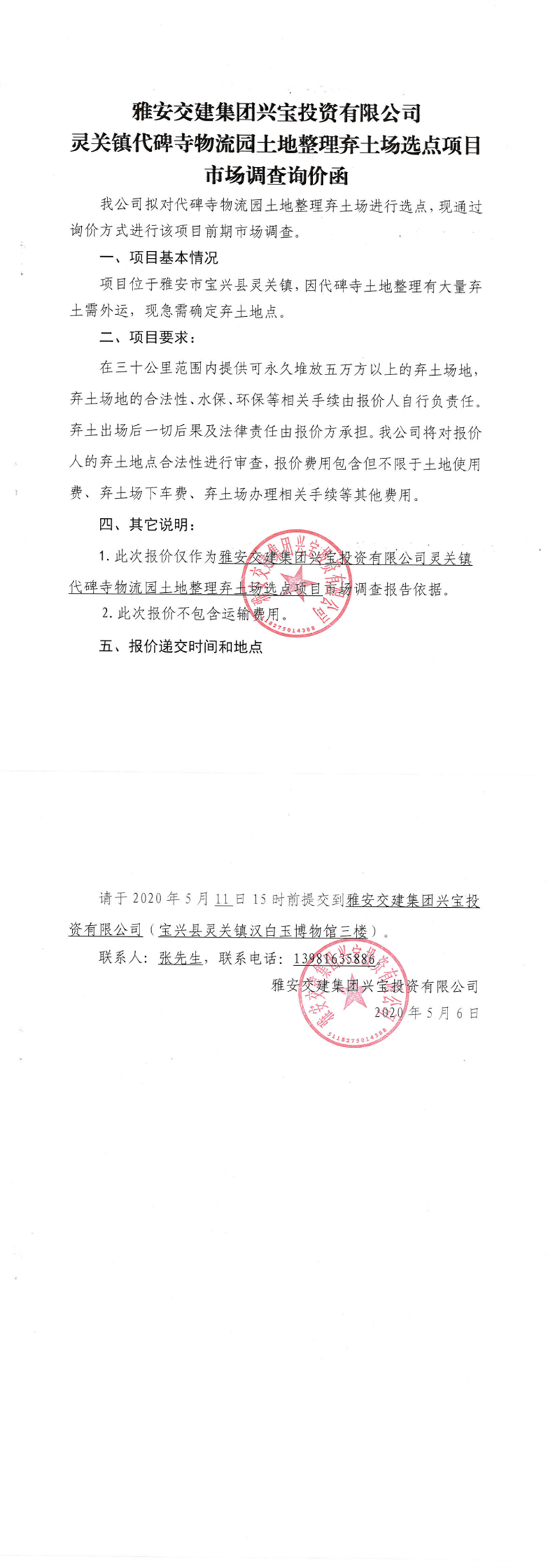 雅安交建集團(tuán)興寶投資有限公司靈關(guān)鎮(zhèn)代碑寺物流園土地整理棄土場選點項目市場調(diào)查詢價函