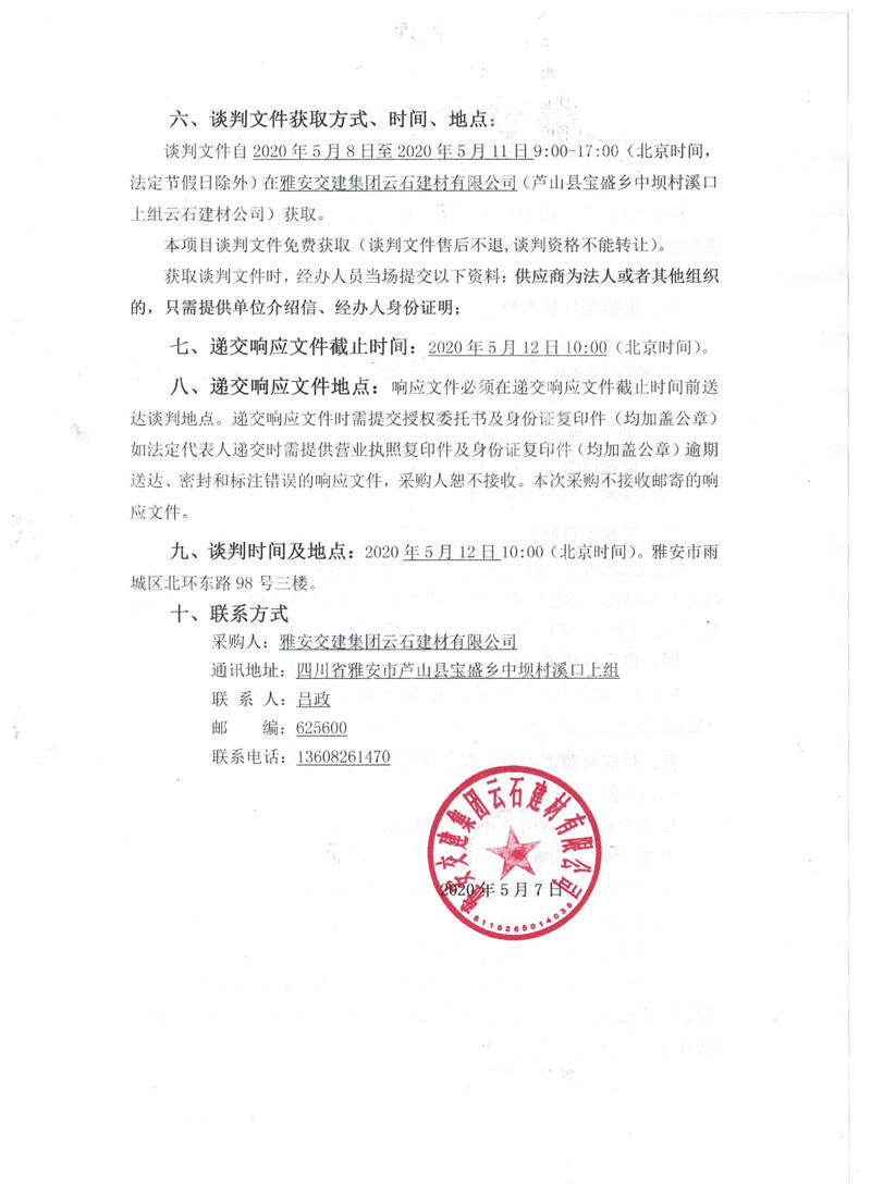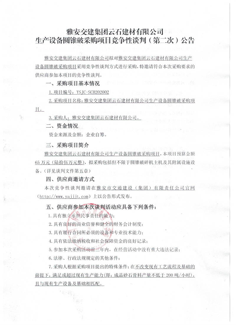 雅安交建集團(tuán)云石建材有限公司生產(chǎn)設(shè)備圓錐破采購項(xiàng)目競(jìng)爭(zhēng)性談判(第二次)公告