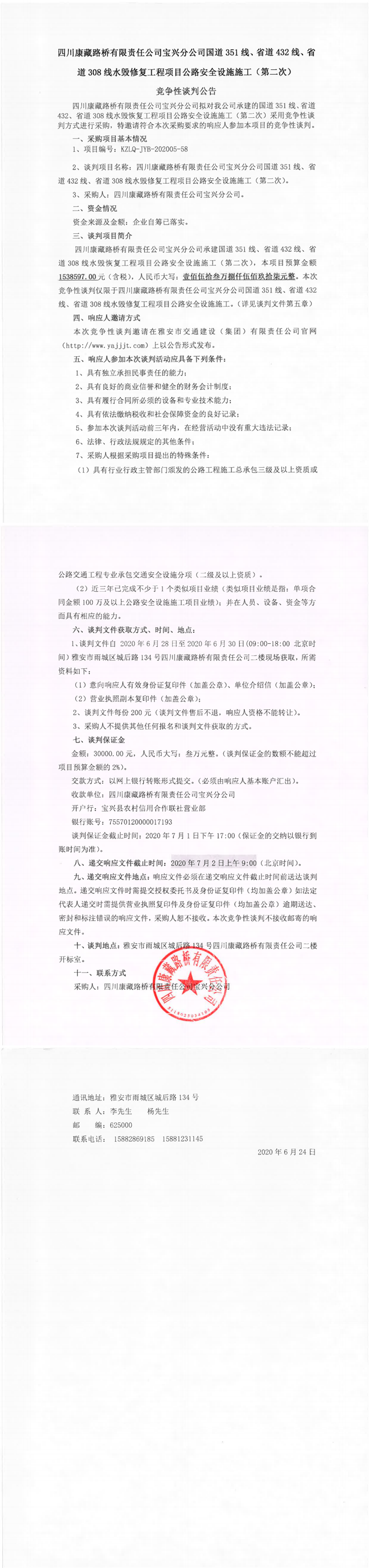 四川康藏路橋有限責任公司寶興分公司國道351線、省道432線、省道308線水毀修復工程項目公路安全設施施工(第二次)競爭性談判公告