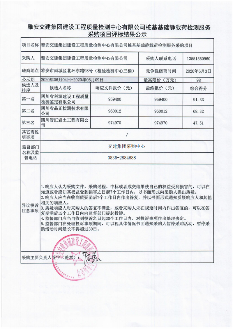 雅安交建集團(tuán)建設(shè)工程質(zhì)量檢測(cè)中心有限公司樁基基礎(chǔ)靜載荷檢測(cè)服務(wù)采購項(xiàng)目評(píng)標(biāo)結(jié)果公示