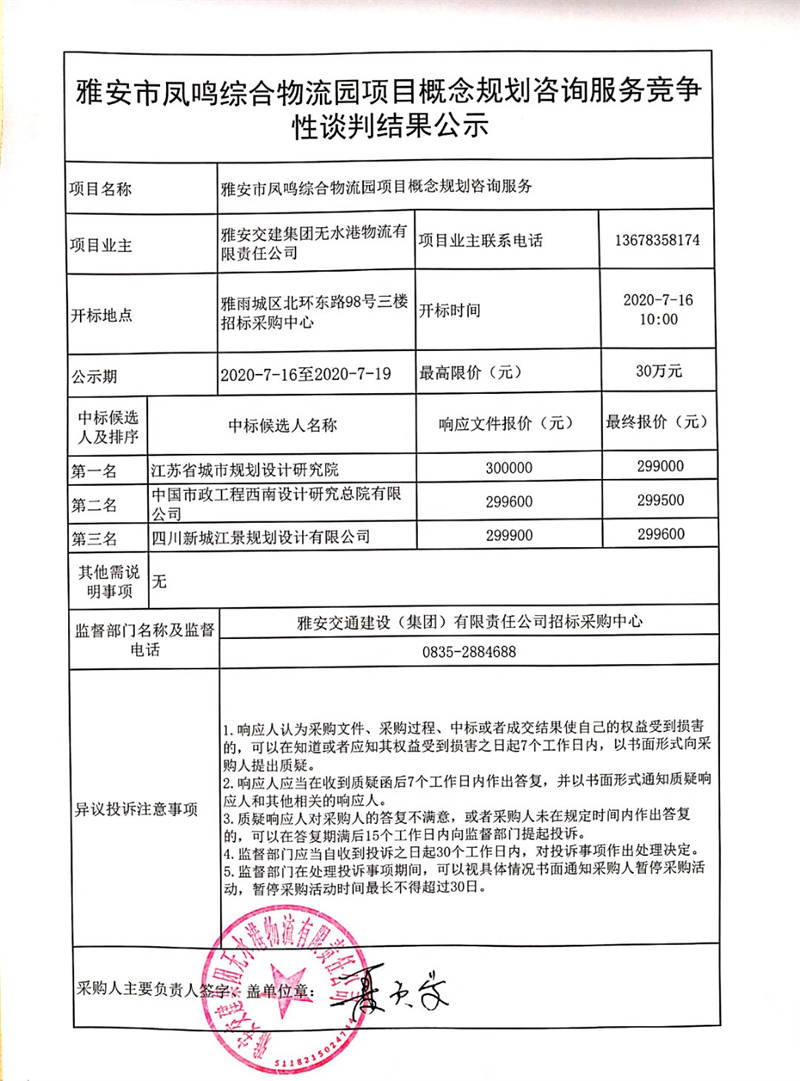 雅安交建集團無水港物流有限責(zé)任公司雅安市鳳鳴綜合物流園項目概念規(guī)劃咨詢服務(wù)競爭性談判結(jié)果公示