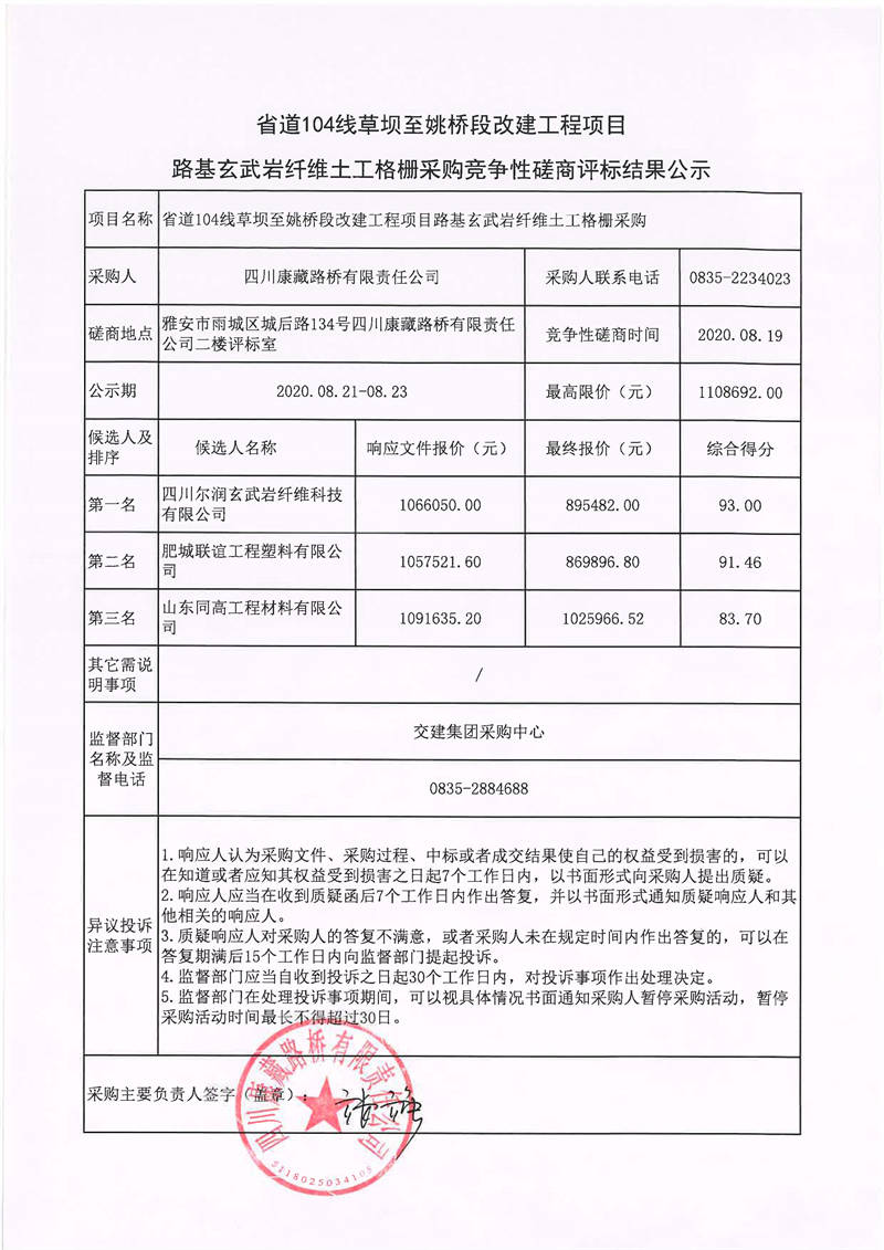 四川康藏路橋有限責任公司省道104線草壩至姚橋段改建工程項目路基玄武巖纖維土工格柵采購競爭性磋商評標結(jié)果公示