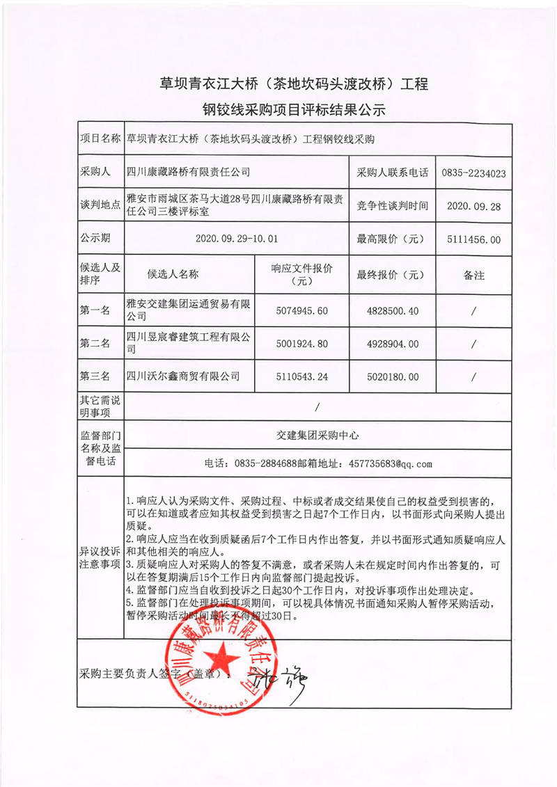 四川康藏路橋有限責(zé)任公司草壩青衣江大橋(茶地坎碼頭渡改橋)工程鋼鉸線采購項目評標結(jié)果公示