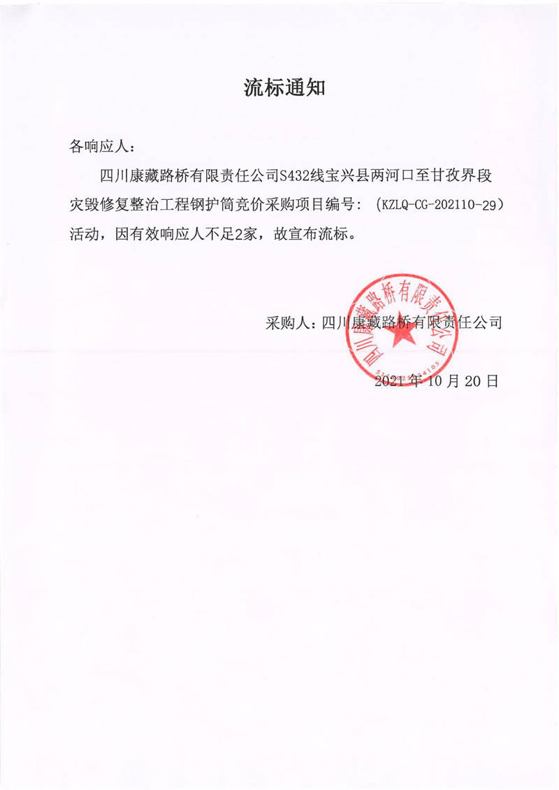 四川康藏路橋有限責任公司S432線寶興縣兩河口至甘孜界段災毀修復整治工程鋼護筒競價采購流標通知