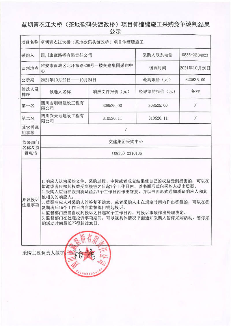 四川康藏路橋有限責(zé)任公司草壩青衣江大橋(茶地坎碼頭渡改橋)項(xiàng)目伸縮縫施工采購(gòu)競(jìng)爭(zhēng)談判結(jié)果公示