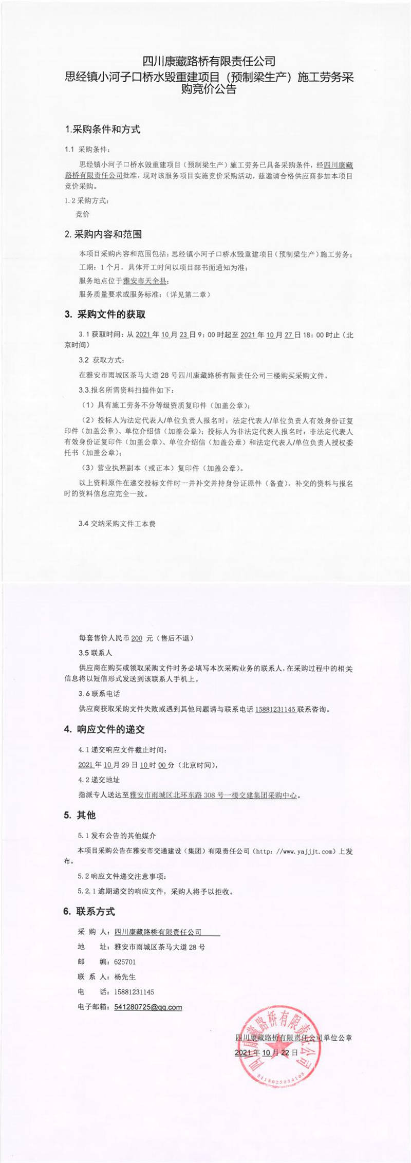 四川康藏路橋有限責(zé)任公司思經(jīng)鎮(zhèn)小河子口橋水毀重建項(xiàng)目(預(yù)制梁生產(chǎn))施工勞務(wù)采購競(jìng)價(jià)公告