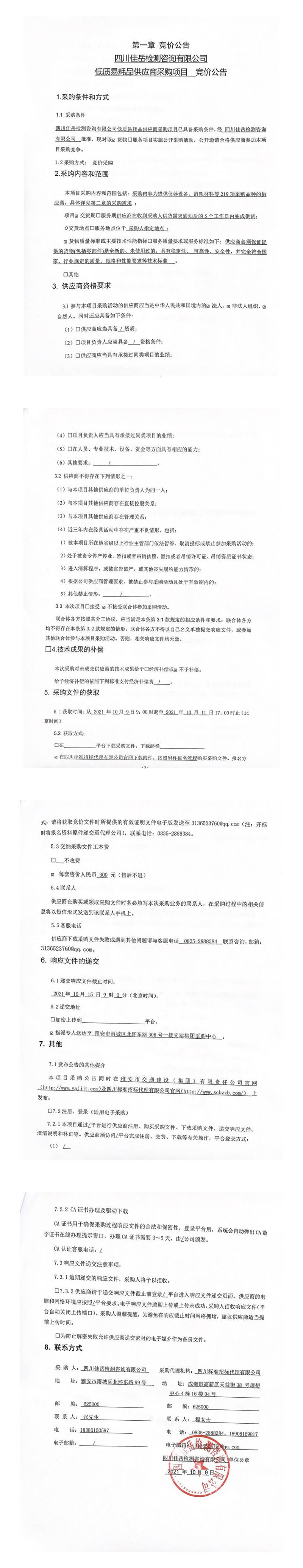 四川佳岳檢測(cè)咨詢有限公司低質(zhì)易耗品供應(yīng)商采購(gòu)項(xiàng)目競(jìng)價(jià)公告