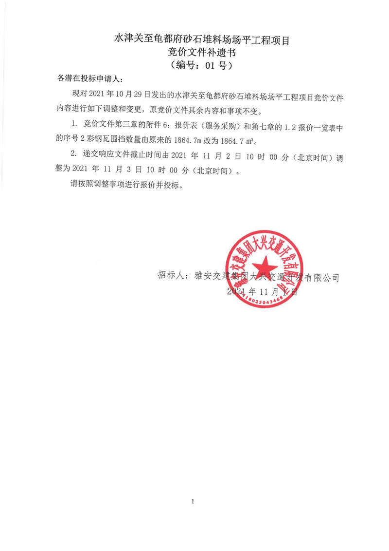 雅安交建集團(tuán)大興交通開發(fā)有限公司水津關(guān)至龜都府砂石堆料場場平工程項(xiàng)目競價(jià)文件補(bǔ)遺書(編號:01號)