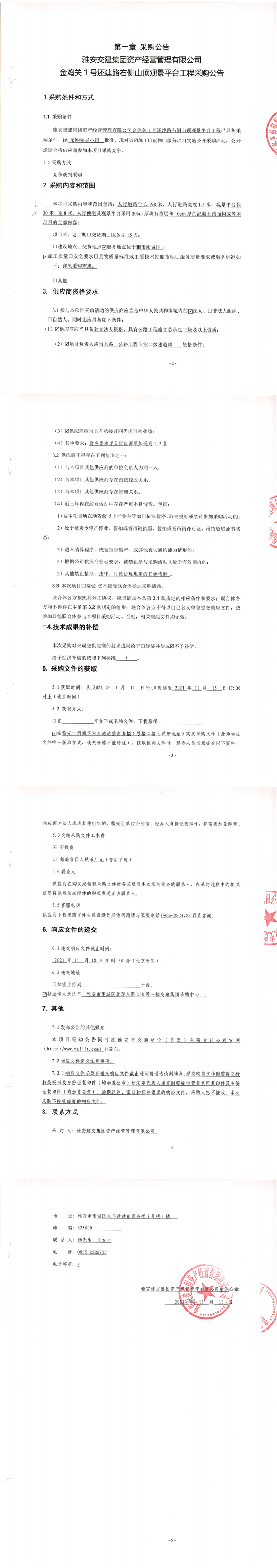雅安交建集團(tuán)資產(chǎn)經(jīng)營管理有限公司金雞關(guān)1號還建路右側(cè)山頂觀景平臺工程采購公告