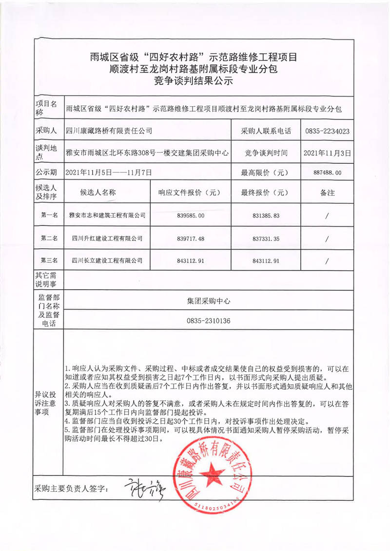 四川康藏路橋有限責任公司雨城區(qū)省級“四好農村路”示范路維修工程項目順渡村至龍崗村路基附屬標段專業(yè)分包競爭談判結果公示