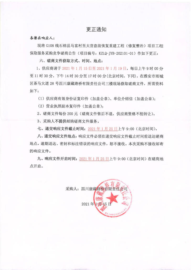 四川康藏路橋有限責(zé)任公司G108線石棉縣馬富村至大營(yíng)盤段恢復(fù)重建工程(修復(fù)整治)項(xiàng)目工程保險(xiǎn)服務(wù)采購(gòu)更正通知